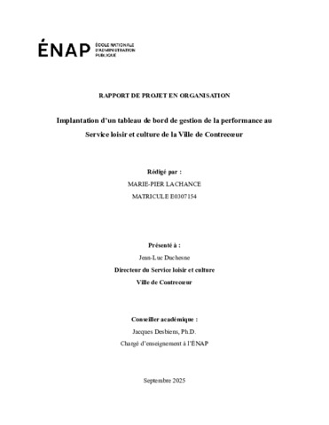 Lachance, Marie-Pier (2025). Implantation d’un tableau de bord de gestion de la performance au Service loisir et culture de la Ville de Contrecoeur. 54 p.