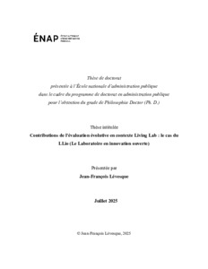 Lévesque, Jean-François (2025). Contributions de l’évaluation évolutive en contexte Living Lab : le cas du LLio (Le Laboratoire en innovation ouverte). Thèse. École nationale d'administration publique (ENAP), 476 p.