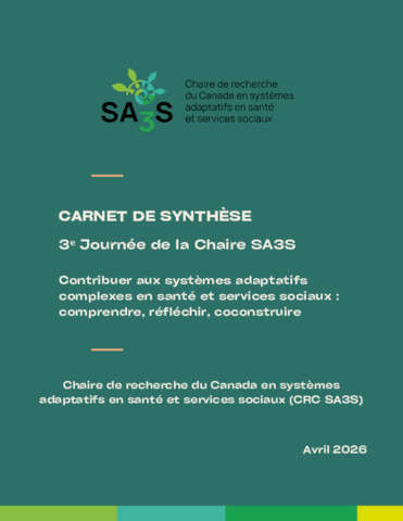 Ce carnet synthétise les conférences, sessions thématiques et activités organisées lors de la 3e Journée de la Chaire de recherche du Canada en systèmes adaptatifs en santé et servicessociaux (CRC SA3S), qui a eu lieu à Montréal le 25 septembre 2025 et avait pour thème : Contribuer aux systèmes adaptatifs complexes en santé et services sociaux : comprendre, réfléchir, coconstruir.